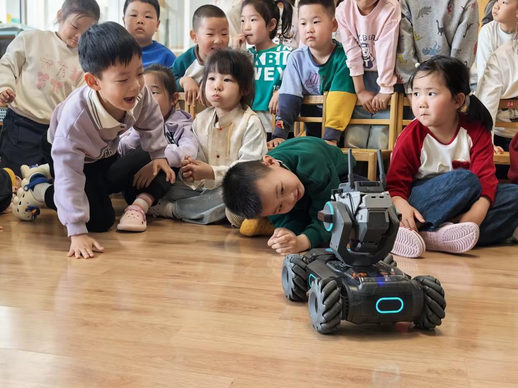 随后,“翼航科技营”的学生向幼儿进行了多个项目展示,并手把手教幼儿操作机器人。在孩子们的欢呼雀跃中,为他们打开科技世界的大门。