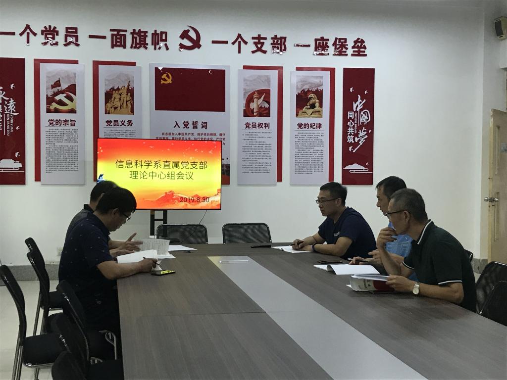 根据学校对二级理论中心组的学习要求和系部安排实际,信息科学系直属党支部于2019年8月30日在系党员活动室召开理论中心组会议,会议由信息科学系直属党支部书记王松江主持,支部全体委员和理论中心组成员参加了会议。