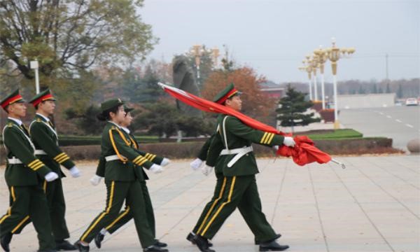 在庄严的出旗乐曲中,我系国旗护卫队队员手持国旗正步走向旗杆。伴随着嘹亮的《义勇军进行曲》,鲜艳的五星红旗在国歌声中冉冉升起、迎风飘扬,全体师生带着对国旗神圣的敬仰、对淄博师专欣欣向荣的自豪、对工作学习愈加美好的期盼,向国旗行注目礼,唱中华人民共和国国歌,现场气氛庄严隆重。