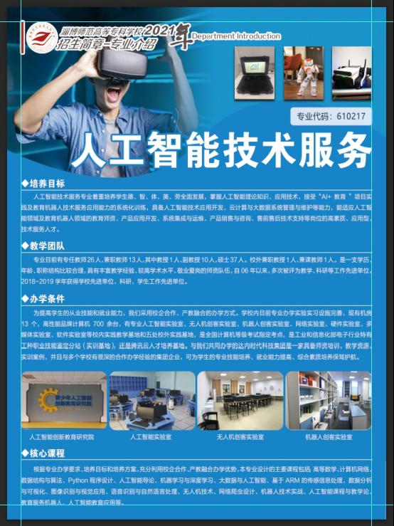 人工智能技术服务专业着重培养学生德、智、体、美、劳全面发展,掌握人工智能理论知识、应用技术,接受“AI+教育”项目实践及教育机器人技术服务应用能力的系统化训练,具备人工智能技术应用开发、云计算与大数据系统管理与维护等能力,能适应人工智能领域及教育机器人领域的教育师资、产品应用开发、系统集成与运维、产品销售与咨询、售前售后技术支持等岗位的高素质、应用型、技术服务人才。
