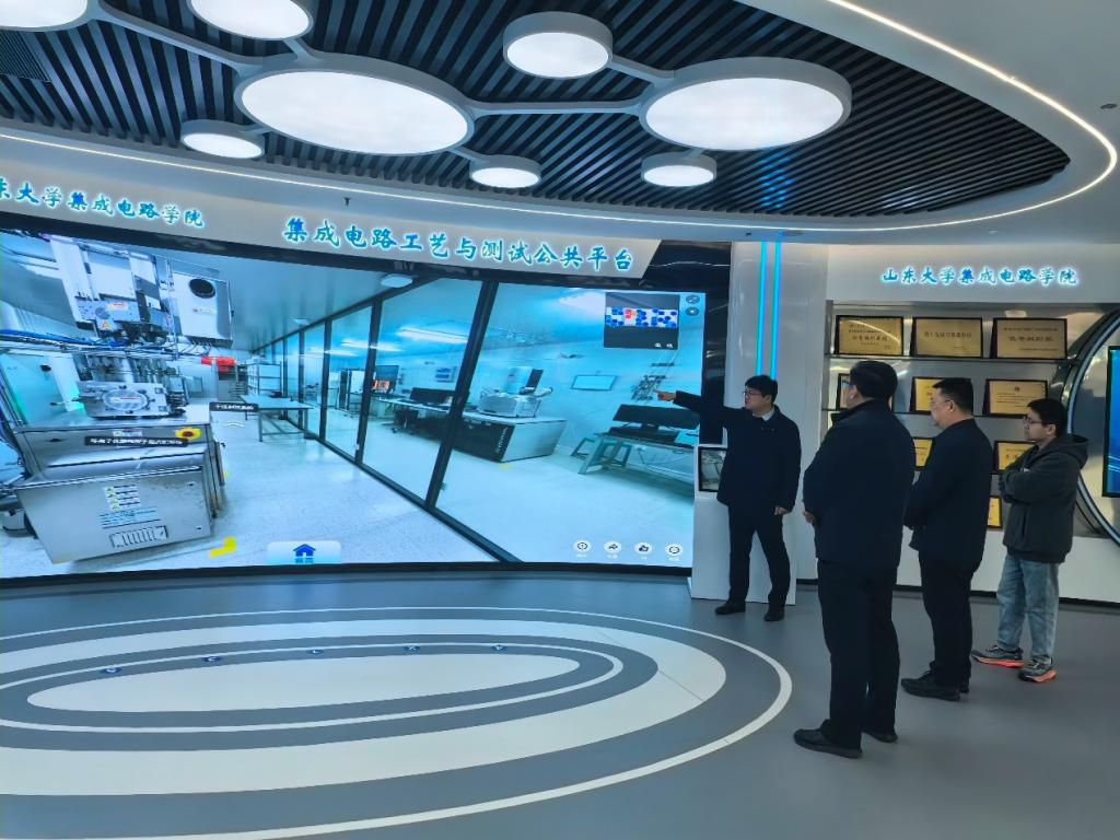 在集成电路学院展厅,副院长李虎介绍了学院发展历史及办学情况,展示了山东大学在集成电路教学实验、科学研究、社会服务、场景应用、一生一芯等方面取得的丰硕成果,凝结了学院在人才培养方面的科研深度、服务广度和育人温度。