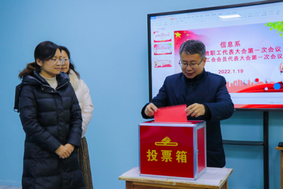 会议开始后,首先系主任赵一兵向大会作了题为《凝心聚力,追求卓越,全面推动我系工作再上新台阶》的工作报告,全面回顾了一年以来我系在教育教学、对外交流与合作、师资队伍建设、学生管理以及实训室建设等方面取得的丰硕成果。系党支部书记陈会秋从发展环境、指导思想、基本原则、总体目标、主要任务、实施保障等方面详细介绍了我系“十四五”建设规划的相关工作。系副主任邹春杰向大会做了我系2021年度的财务工作报告。与会代表分组认真审议了系工作报告、“十四五”规划、财务工作报告、工会工作报告和提案工作报告。大会以举手表决的方式通过了系工作报告决议(草案)、系“十四五”规划决议(草案)、财务工作报告决议(草案)、工会工作报告决议(草案)和提案工作报告决议(草案)。与会代表通过无记名投票方式,选举产生了我系第一届工会委员会委员。